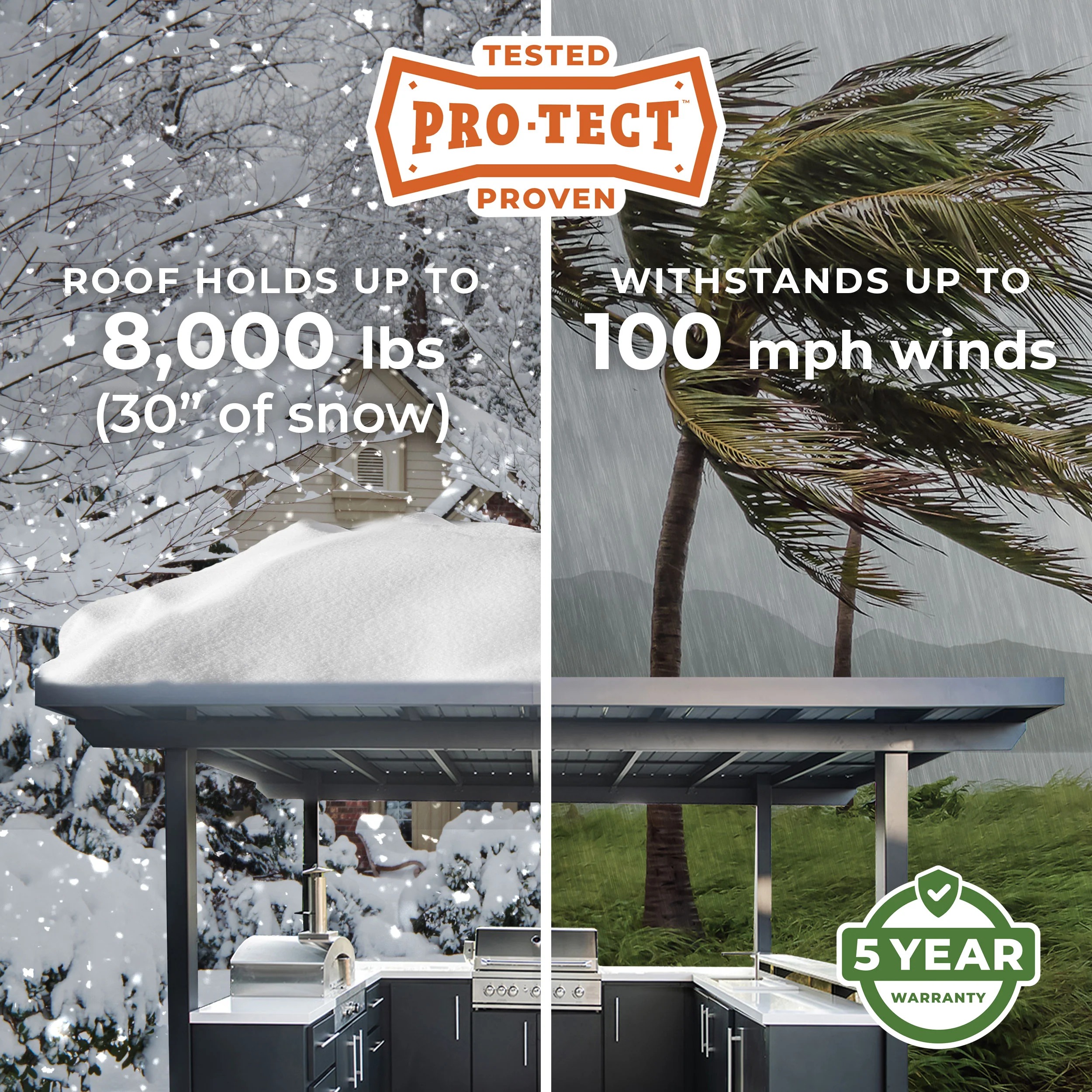All-Weather Durability: Pro-Tect™ tested and proven to withstand up to 8,000 pounds or 30 inches of snow load, and winds up to 100 mph* with a full coverage galvanized steel roof*